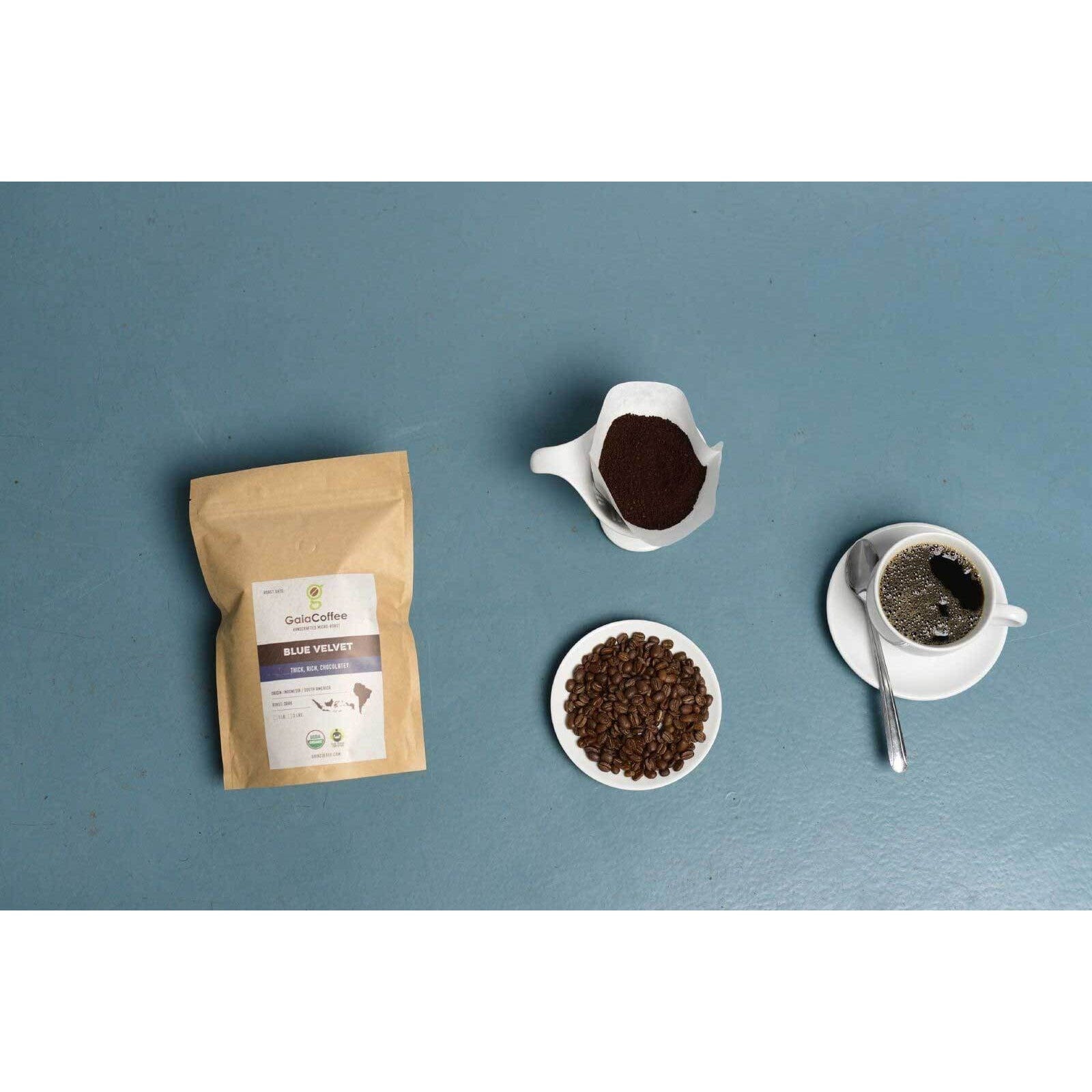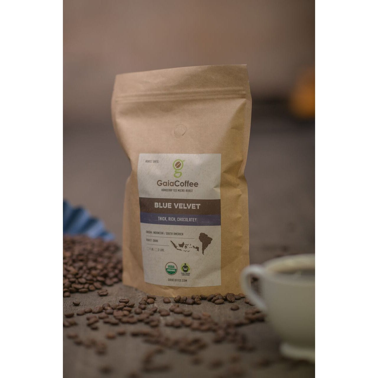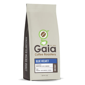 Blue Velvet is a unique dark roast coffee blend of beans from Indonesia and South America, providing a full body and rich, smoky flavor. Enjoy the smooth and slightly sweet notes of this handcrafted, specialty roasted coffee.